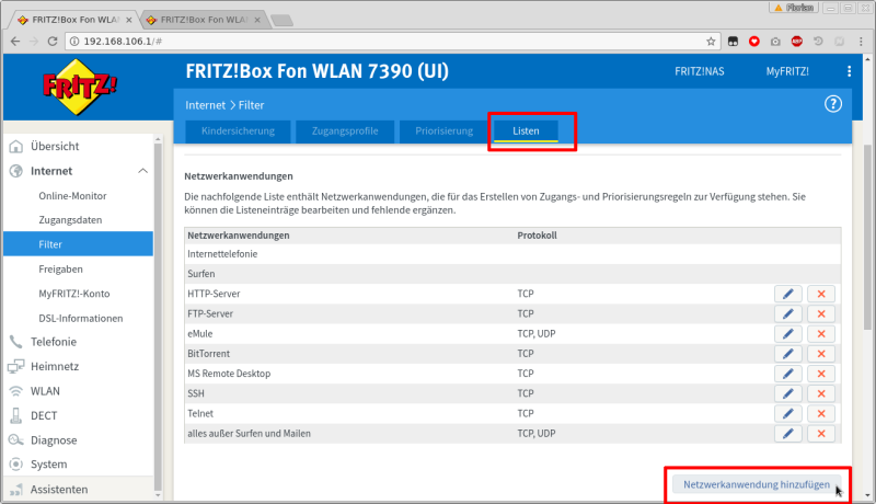 Internet → Filter → Listen → Netzwerkanwendung hinzufügen